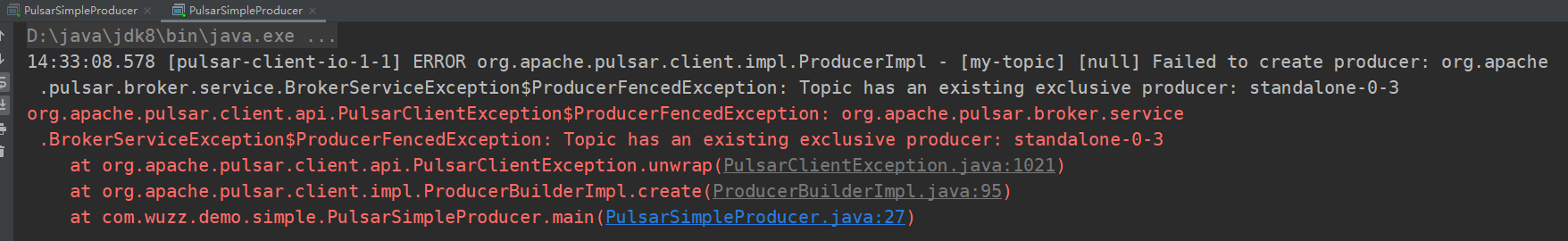 访问模式分为 Shared(默认),Exclusive。当设置为 Exclusive ,是不允许同时有多个生产者向该topic 发送消息,否则将抛出以下异常: