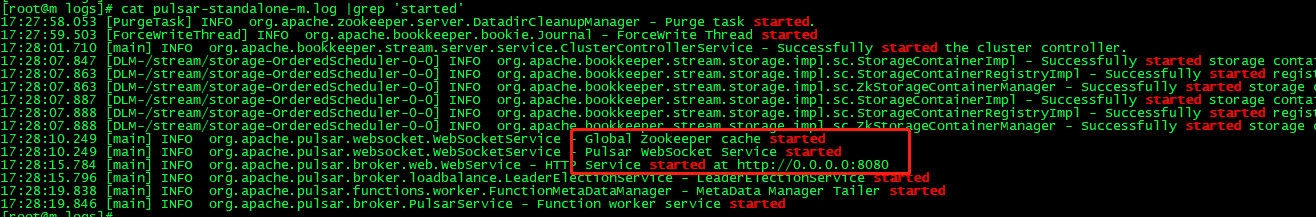 在 logs 目录下会出现一个 pulsar-standalone-m.log 日志,查看一下 看到如下信息说明服务启动成功。