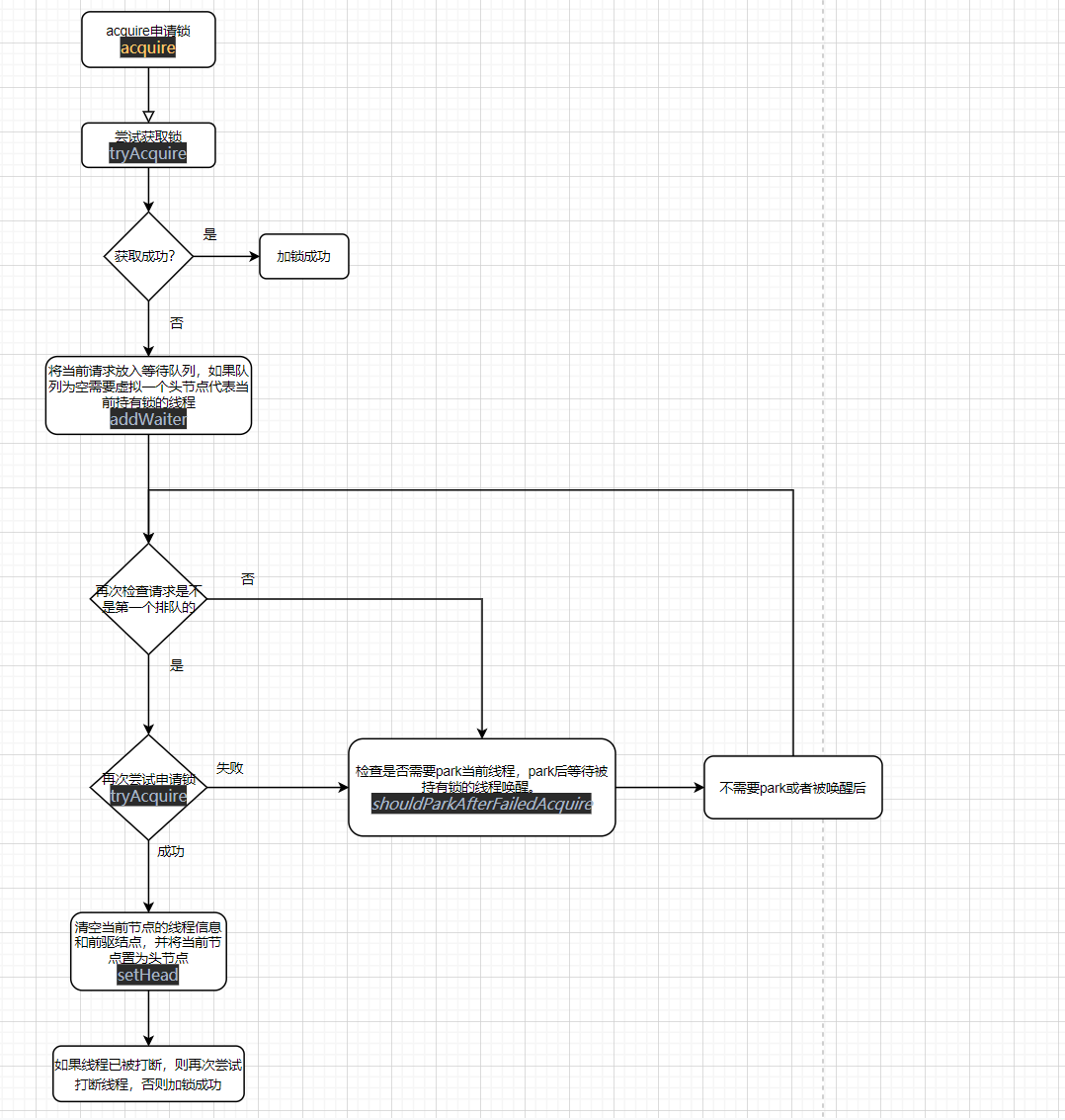该方法首先会调用tryAcquire(arg)尝试获取锁,如果获取成功则返回加锁成功,否则当前线程请求进入等待队列等待被持有锁的线程唤醒。