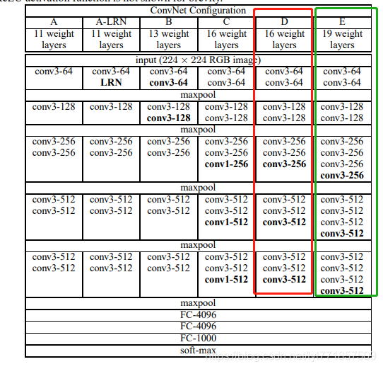 论文中几个模型主要以几下几种方案A、B、C、D、E。目前主要还是采用VGG16和VGG19也就是下图中的分别红框和绿框部分。