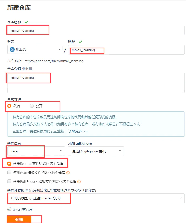 登录Gitee(码云)账号,新建仓库