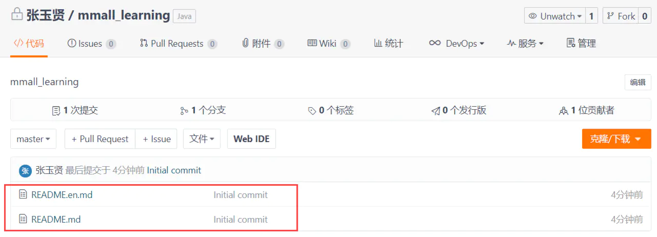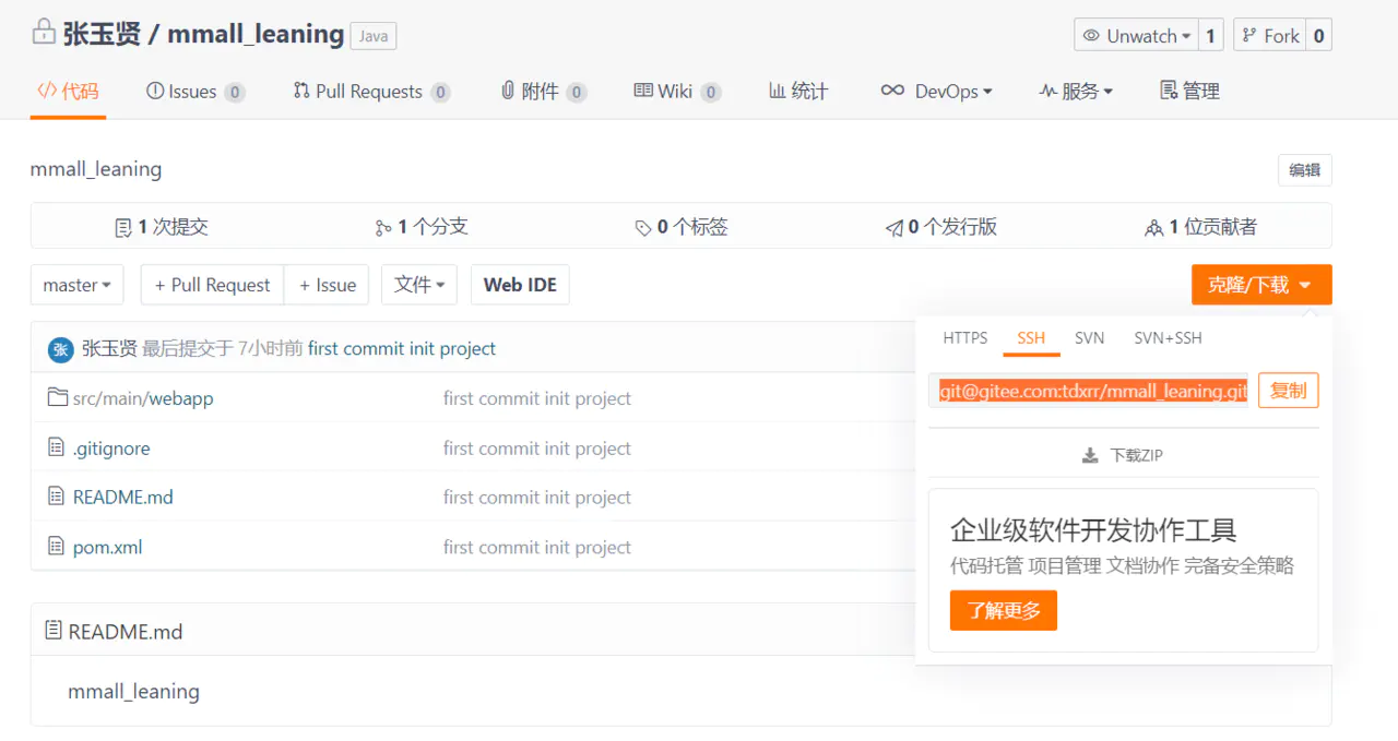 复制代码此时再看Gitee,已经推送成功了,到这,Git的初始化已经完成了