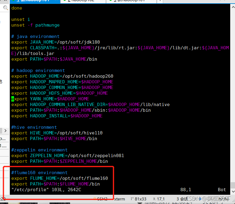 #flume160 environment export FLUME_HOME=/opt/soft/flume160 export PATH=$PATH:$FLUME_HOME/bin