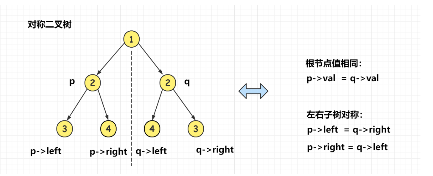 2、同步移动这两个指针来遍历这棵树,每次检查当前 p 和q 节点的值是否相等,如果相等再判断左右子树是否对称。