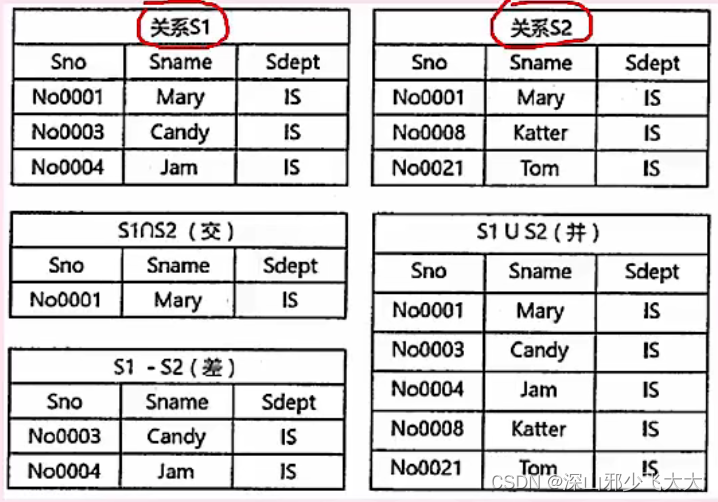 - 差:S1-S2,结果是S1表中有而S2表中没有的那些记录。