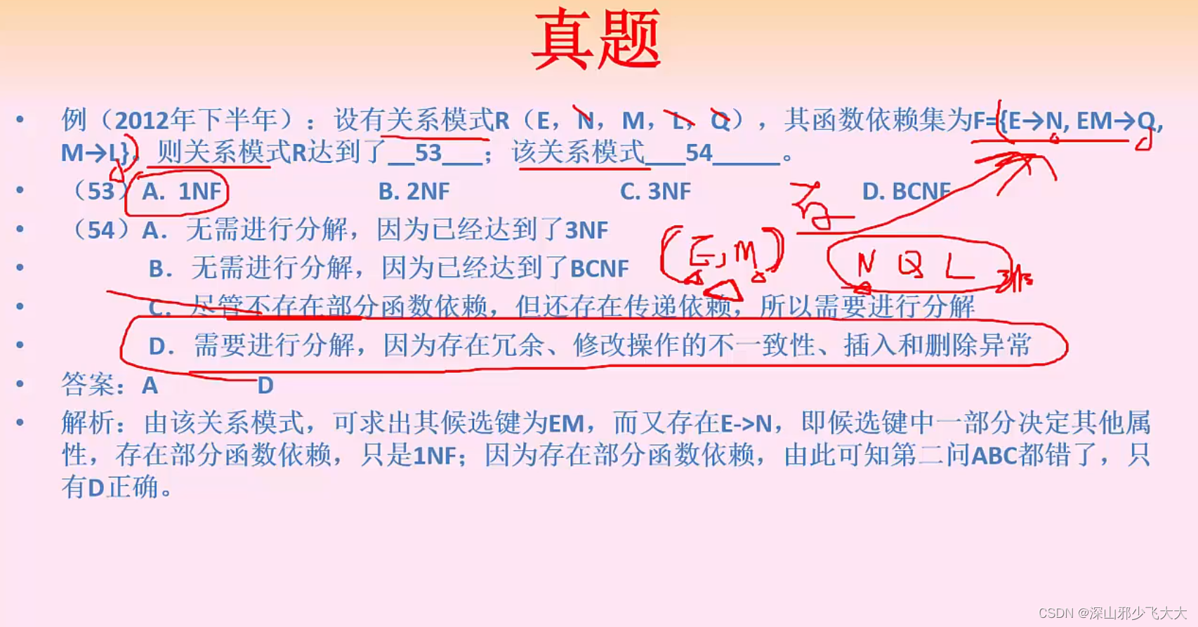 - 第三范式3NF:当且仅当R是2NE,且R中没有非主属性传递依赖于候选键时,R就是3NF(此时,也不会存在部分依赖)。一般解决方法是拆分传递依赖的非主属性为一个新的关系模式,本质就是主键要直接决定所有非主属性,不能通过非主属性间接决定。