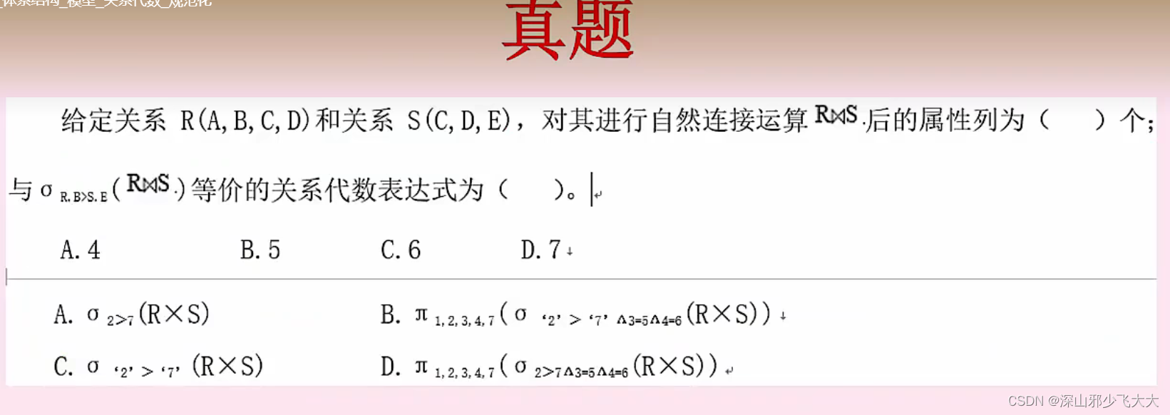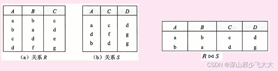 - 设有关系R、S如下左图所示,自然连接结果如下右图所示(记住符号):