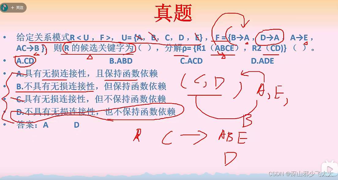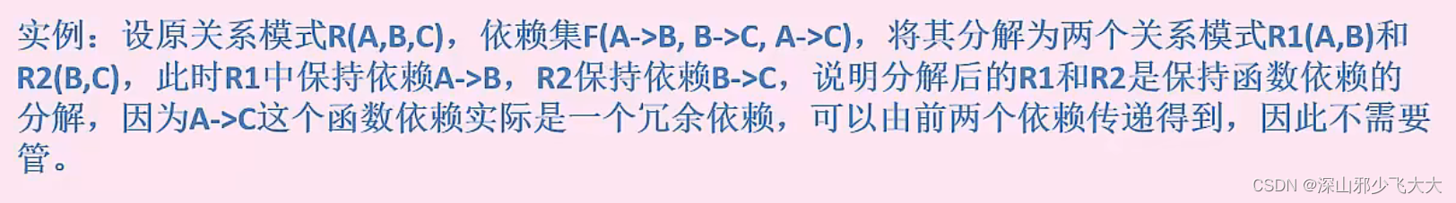 - 对于关系模式R,有依赖集F,若对R进行分解,分解出来的多个关系模式,保持原来的依赖集不变,则为保持函数依赖的分解。另外,注意要消除冗余依赖(如传递依赖)。