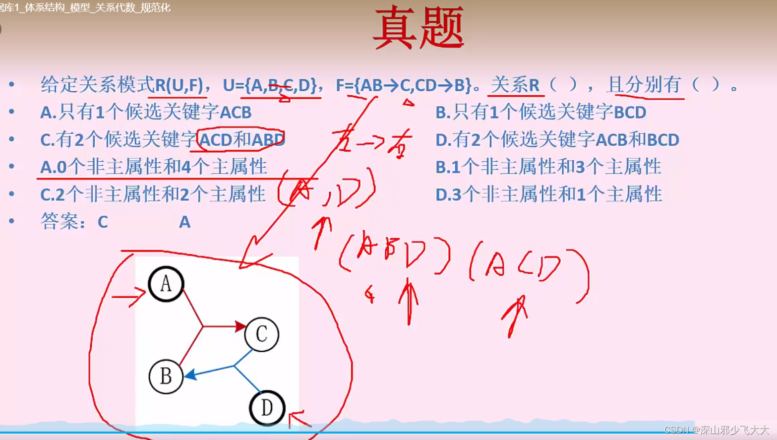 思路:先画图,找出入路为0的属性,候选键必定包含入路为0的属性,从而根据推导关系可以推导出其余全部属性。候选键中的属性都算主属性。