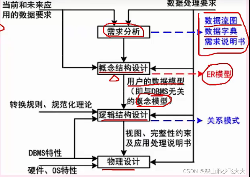 - 需求分析:即分析数据存储的要求,产出物有数据流图、数据字典、需求说明书。
