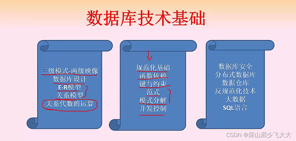 - 数据模型三要素:数据结构(所研究的对象类型的集合)、数据操作(对数据库中各种对象的实例允许执行的操作的集合)、数据的约束条件(一组完整性规则的集合)。