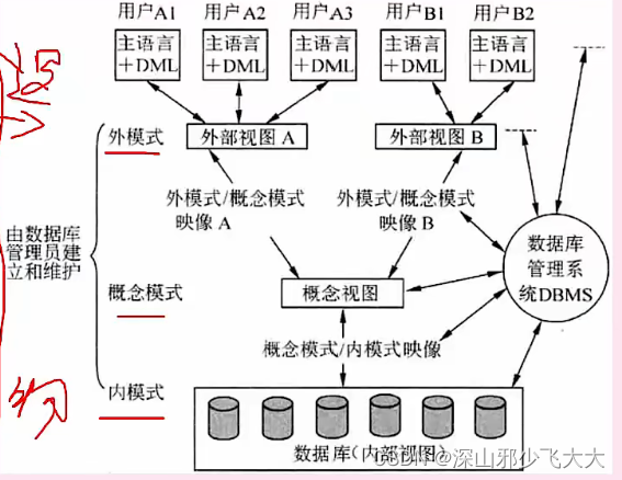 - 外模式-模式映像:是表和视图之间的映射,存在于概念级和外部级之间,若表中数据发生了修改,只需要修改此映射,而无需修改应用程序。