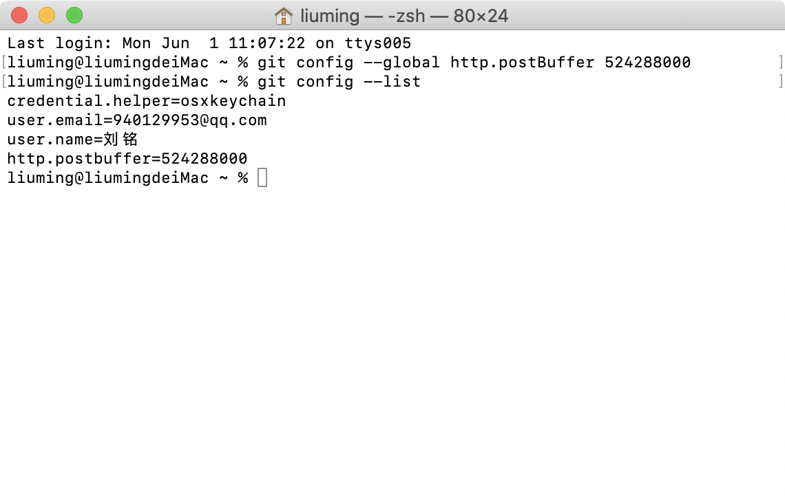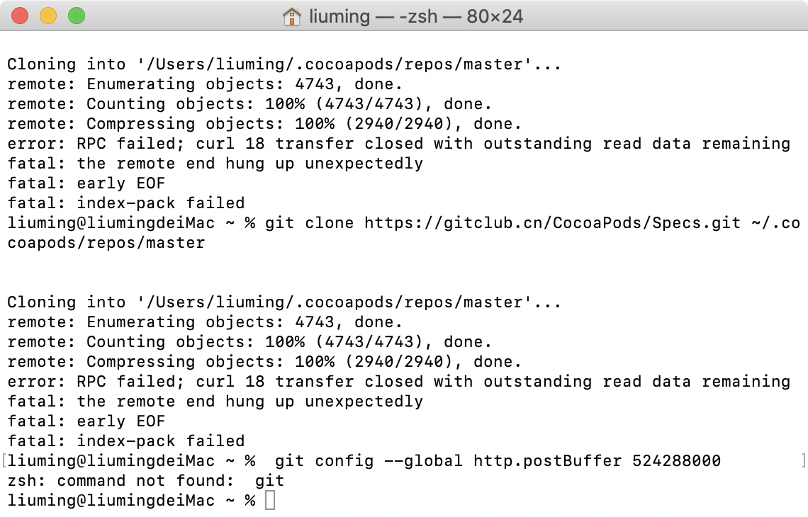 究其原因是因为curl的postBuffer的默认值太小,我们需要调整它的大小,在终端重新配置大小