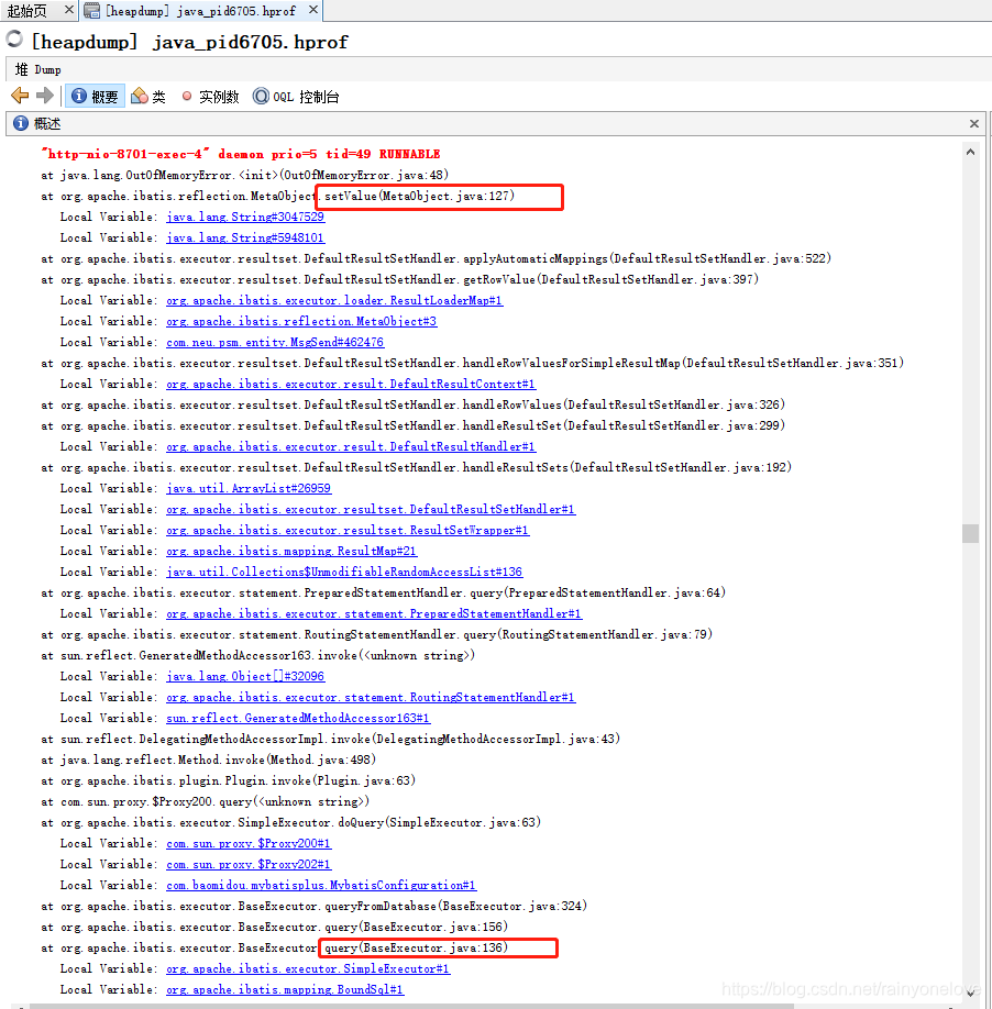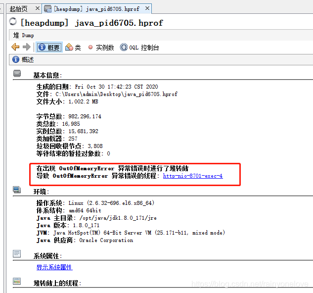 一段时间之后又遇到这种问题。现在有dump文件可以看了。服务器相应目录里有这种文件名:java_pid6705.hprof,download下来用jdk自带的jvisualvm.exe打开,在java的bin目录里能找到这个工具。
