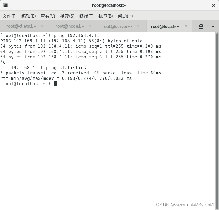 [root@node1 ~]# iptables -A FORWARD -s 192.168.4.0/24 -d 192.168.2.0/24 -p icmp -j ACCEPTclient1和server1已经可以ping通了