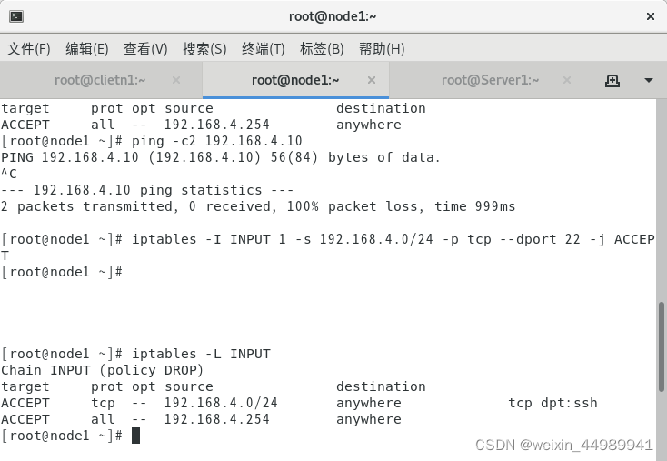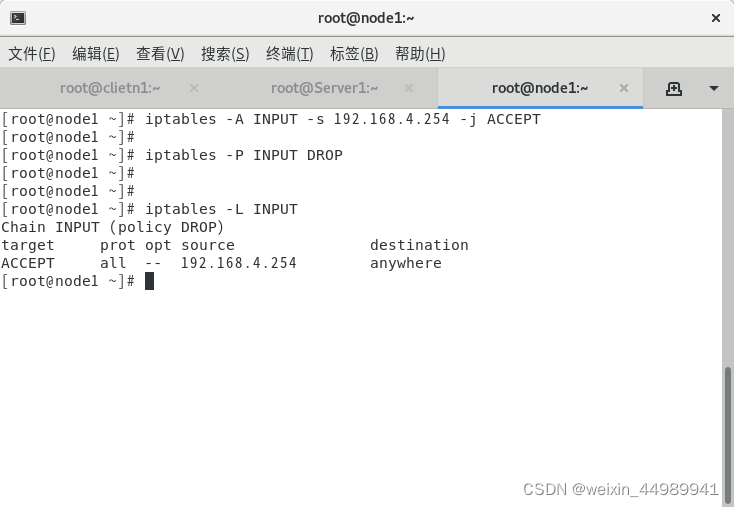 [root@node1 ~]# iptables -A INPUT -s 192.168.4.254 -j ACCEPT