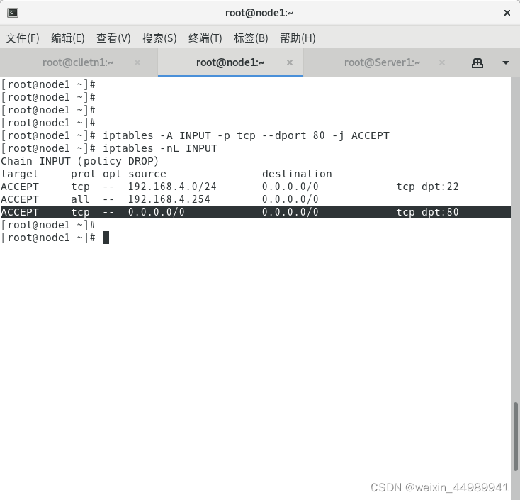 [root@node1 ~]# iptables -A INPUT -p tcp --dport 80 -j ACCEPT