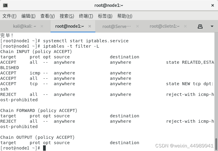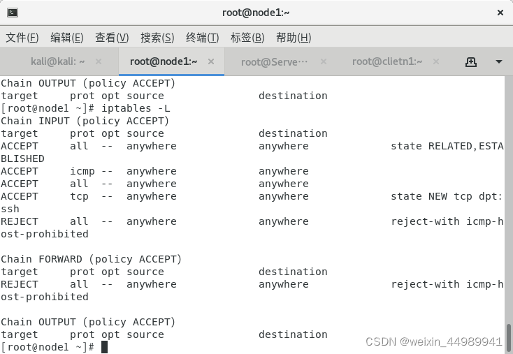 [root@node1 ~]# iptables -t filter -L # 所有规则链都是空的