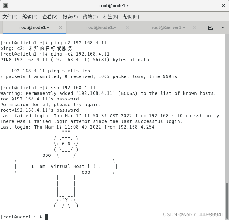测试,192.168.4.10已经可以ssh到node1,但是ping不通,因为只允许了ssh