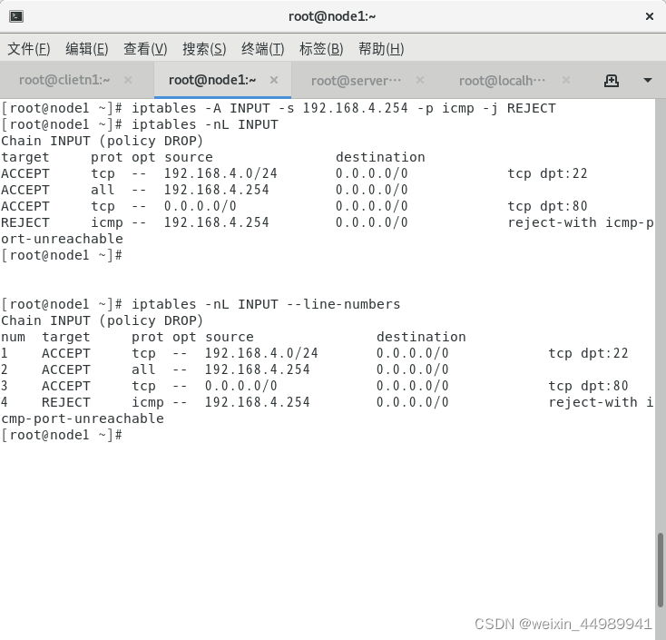 拒绝192.168.4.254 ping node1。-I不指定位置,默认插到最上面