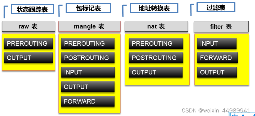 [root@node1 ~]# yum install -y iptables-services.x86_64 iptables的表和链。我们只关心nat表和filter表。filter表是默认的表,它实现防火墙,也就是包过滤的功能。nat表实现网络地址转换。
