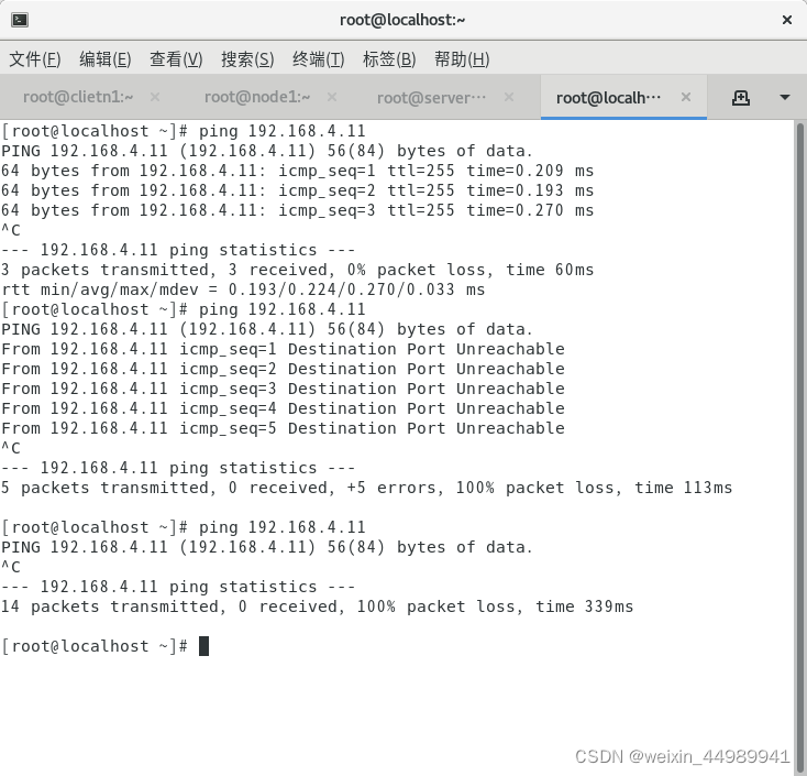[root@node1 ~]# ping -c2 192.168.4.10 # 失败