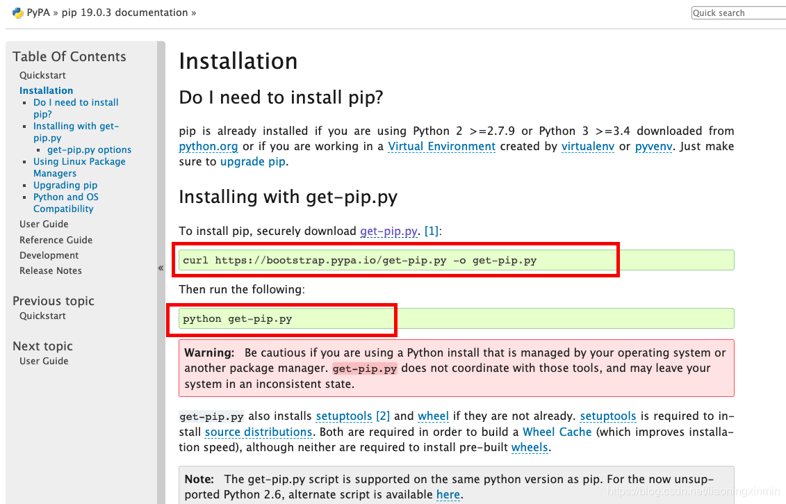 通过查看官网指定的安装python教程(https://pip.readthedocs.io/en/stable/installing/),官网打开较慢,直接上图: