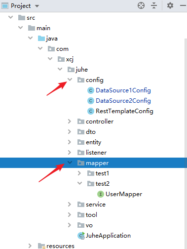 创建两个数据源配置类 >>> yml配置中对应配置两个数据源 >>> mapper目录下创建两个目录区分连接的数据源。