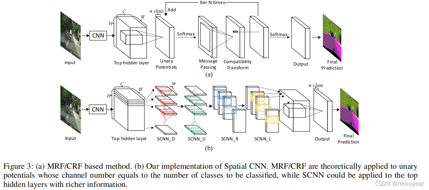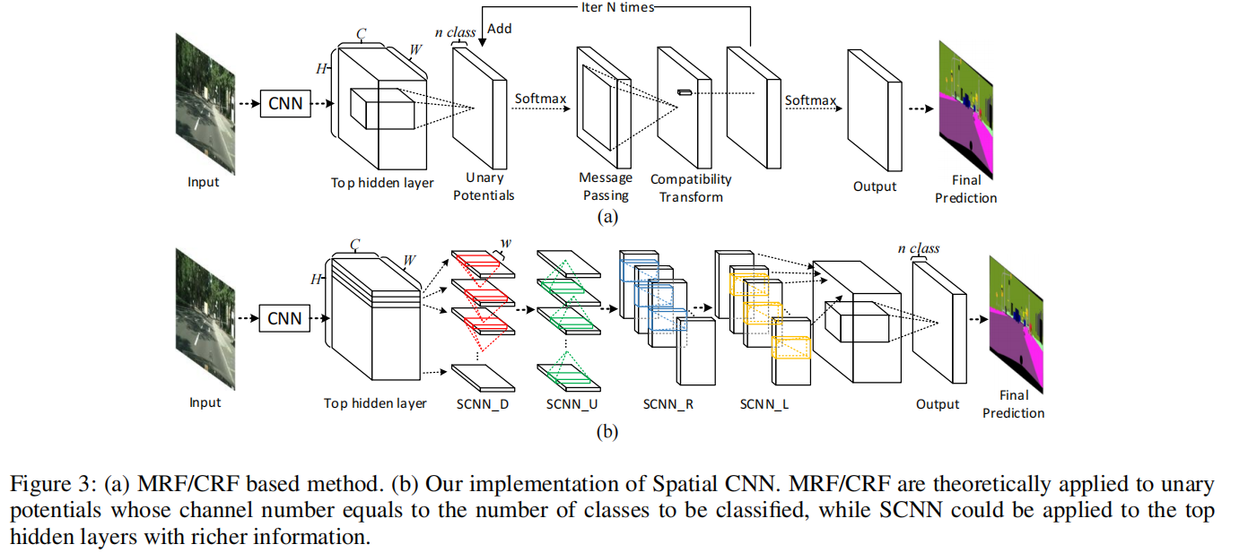 (a)为传统的CNN+CRF框架。(b)中的中间四个模块为SCNN,是嵌入到主干网络中的结构。