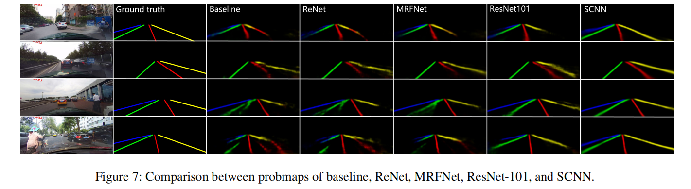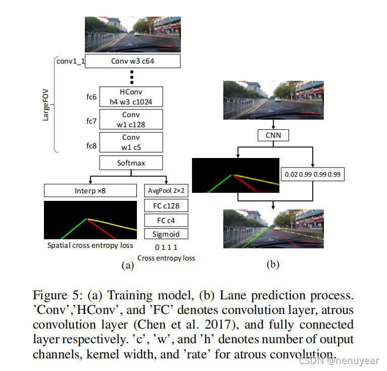 (b)图为原图像通过在上述模型的基础上,添加了一个分支,即右边的部分用来预测4条车道线存在的概率。左边输出的概率图经过这个分支网络预测车道线是否存在。