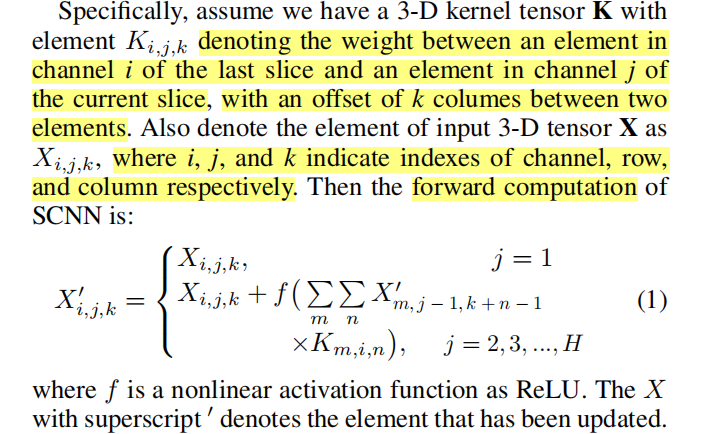 SCNN_D:为四个模块之一,其模块内部从上到下卷积时共享同一个卷积核。首先切成H片,在第一片上面用C*w大小的卷积核卷积,由于有C个通道,所以要用C个C*w的卷积核,第一片经过卷积,非线性等操作后加到下一片上(一般这个w是个较大的卷积核,作者实验证明w=9结果最理想),直到最后一片也被更新。