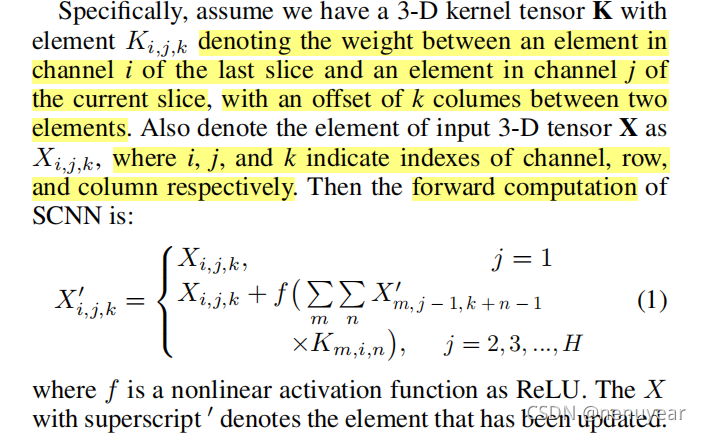 等号左边为更新后的值,右边f为非线性激活函数,K(i,j,k ):最后一片中通道i的元素和当前片中通道j的元素之间的权重,这两个元素之间偏移为k列。