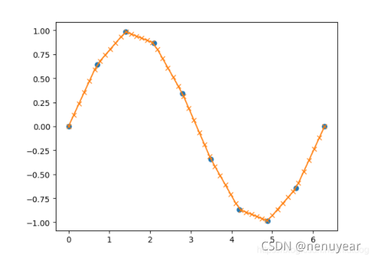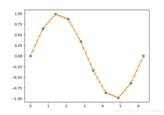 Interp:一维线性插值函数,例如下图为sin函数的插值。(文中在此对像素点进行了处理)