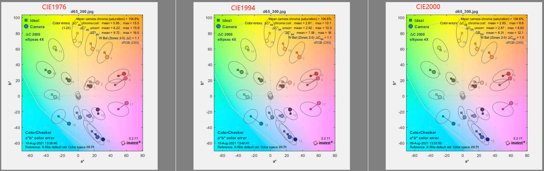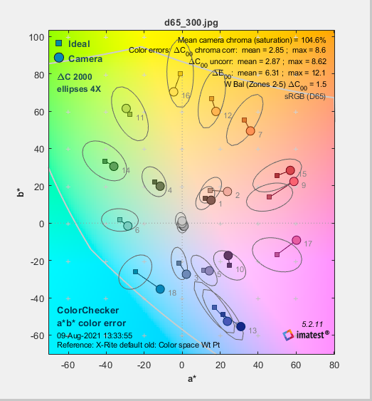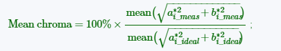 f、Mean camera chroma: 是相机颜色的平均色度(饱和度)除以理想色块颜色的平均色度(饱和度),用百分数表示。 一个颜色的饱和度就是它到原点的距离