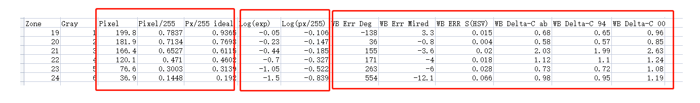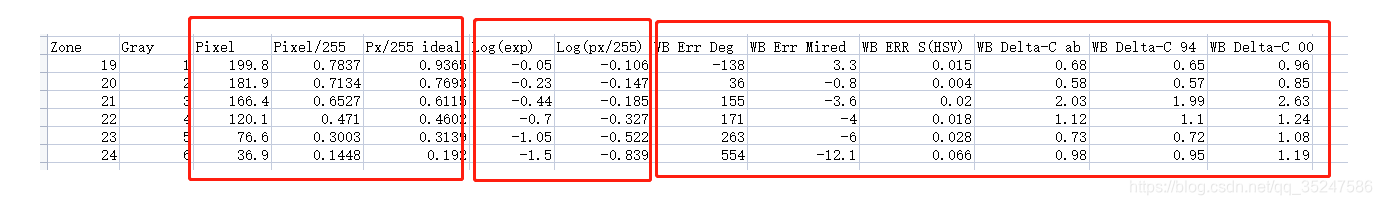 b、Pixel代表测量出的19-24灰块的亮度,计算公式为: Brightness = 0.3 * R + 0.6 * G + 0.1 * B.最大值是255,Pixel/255是标准化的表示,pixel/255 ldeal是理想状态下的值;