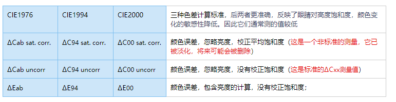 2>、Color error display:颜色误差显示,对应不同的计算色差的标准,CIE1976、CIE1994、CIE2000, 后两者更准确,反映了眼睛对高度饱和度颜色变化的敏感性降低。 因此它们的测量值通常较低 ;