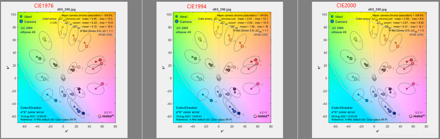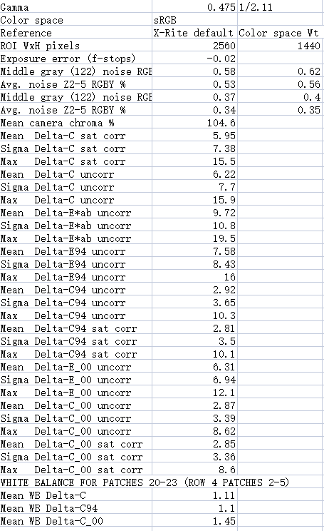 f、包含24色块使用不同标准( CIE1976、CIE1994、CIE2000),得出的颜色误差测量值(与理想Colorcheck 值的差异)、gamma;