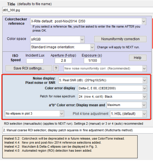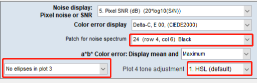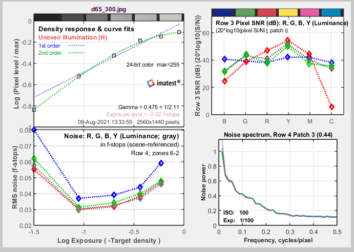 显示密度响应,f-stops噪声(与眼睛的工作相对应的相对测量),第三个Colorchecker行噪声,其中包含原色,以及所选patch的噪声频谱。