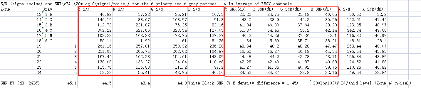 d、表示S/N 和SNR(dB)的测量结果:A-S/N和A-SNR(dB)是两种表示信噪比方式的均值;SNR_BW = 20 log 10( ( S WHITE – S BLACK )/ N mid ),其中 N mid是中间灰色块中的噪声(最接近标称图表密度 = 0.7)。