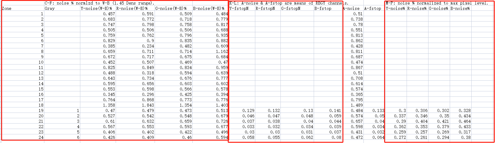 c、如下表示R\G\B\Y 通道的噪声测量值,A-noise和A-fstop表示前面数值的测量均值;