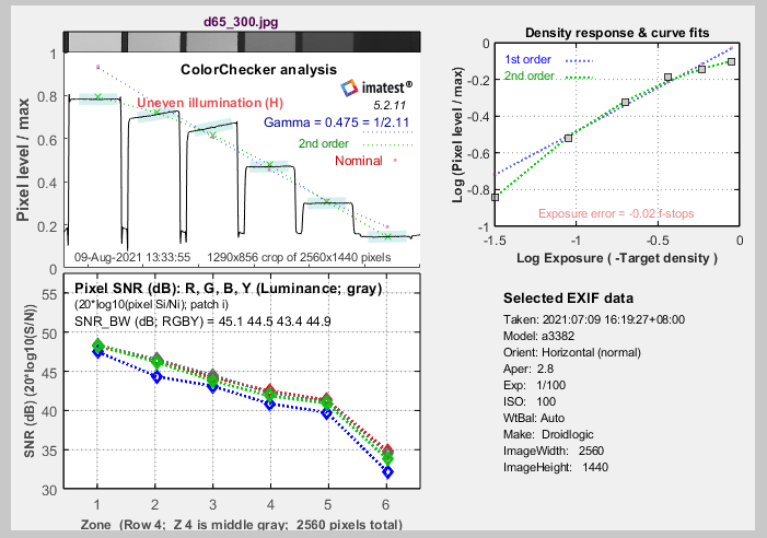 右下方的图显示了所选patch(色块21)的R, G, B, Y噪声谱。频谱传递有关信号处理的线索,例如,异常快速的衰减可能表明噪声降低过度。低空间频率下的高电平或红蓝噪声是典型的拜耳传感器。如果可用,则显示EXIF数据中的ISO速度和曝光时间。