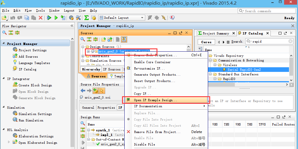 6、IP核综合完毕以后,单击srio_gen2_0,并点击鼠标右键,在弹出的菜单栏中单击Open IP Example Design…