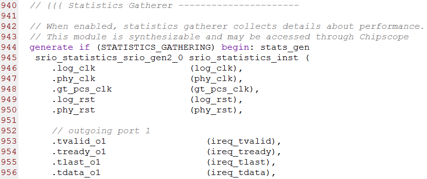 第944行到988行例化了srio_statistics.v模块,这个模块用来收集统计信息,它是一个可综合的模块。部分源码如下图所示
