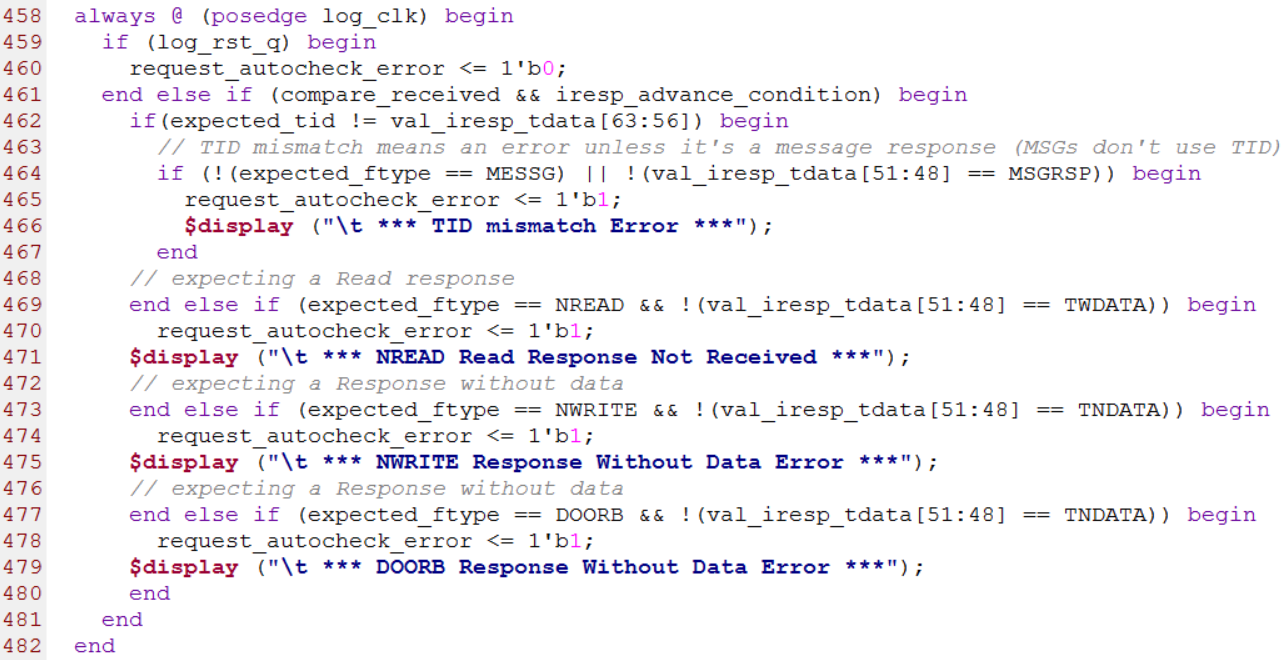 第458行到482行就是把存储在RAM中请求事务的tid,current_ftype和current_size与响应事务对应的字段进行对比,在仿真时给出对应的提示信息。