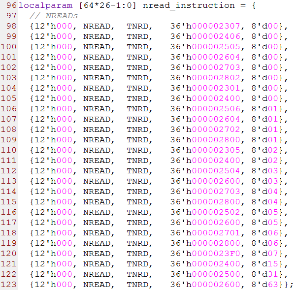 第96行到123行是26个NREAD事务(读事务),其中第1列的12位数据是由8-bit的srcTID,1-bit的保留位,2-bit的prio和1-bit的CRF组成,第2列是FTYPE字段,第3列是TTYPE字段,第4列的36-bit数据是由最高2-bit的保留位和34-bit的address字段组成,第5列是size字段,这个字段的值为实际的数据量减1。比如size=0,表示实际传输的数据量为1。源代码如下图所示