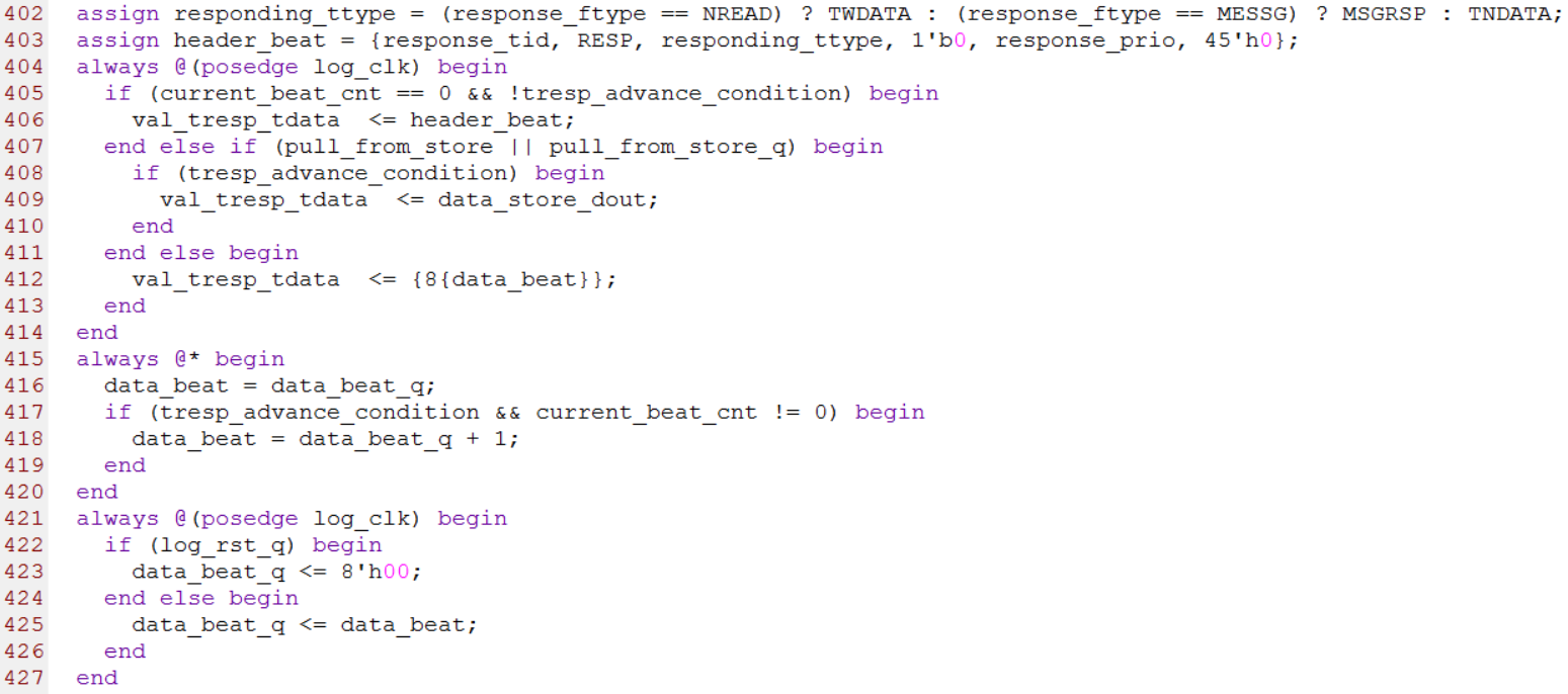 第402行和第403行用来产生响应事务的包头(Header),第404行到414行用来产生响应事务的数据,其中响应事务的第一个有效时钟用来发送包头(Header),后面的有效时钟用来发送数据,这段逻辑也与srio_request_gen.v中对应的逻辑类似。源代码如下图所示
