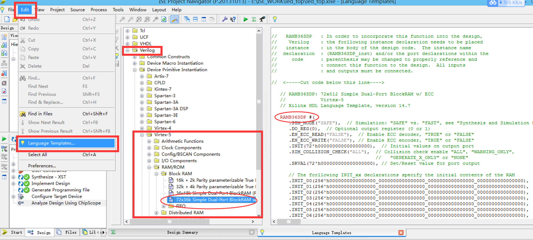 RAMB36SDP是一个大小为36Kb的简单双口Block RAM(SDP=Simple Dual-Port),它其实是Virtex-5系列FPGA的一个原语,Vivado里面并没有RAMB36SDP的语法模板,ISE中才有它的语法模板,如下图所示