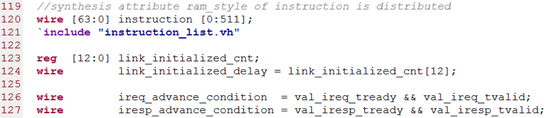第120行定义了一个memory类型变量,综合的时候ram的类型为分布式ram,121行导入了instruction_list.vh头文件,126行定义的变量可以看做AXI4-Stream总线上数据有效的标志位,当这个信号为高时,AXI4-Stream总线上tdata上的数据为有效数据。源代码如下图所示