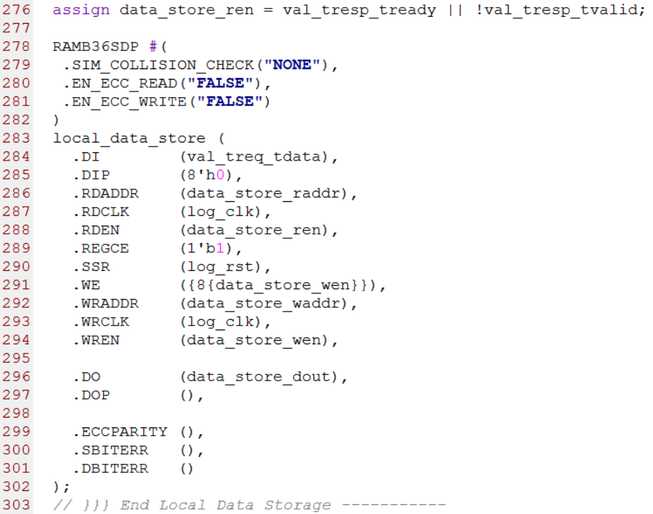 第276行到302行主要例化了一个RAMB36SDP用来存储写事务发送过来的数据。其中第276行用来产生数据存储的读使能标志。源代码如下图所示