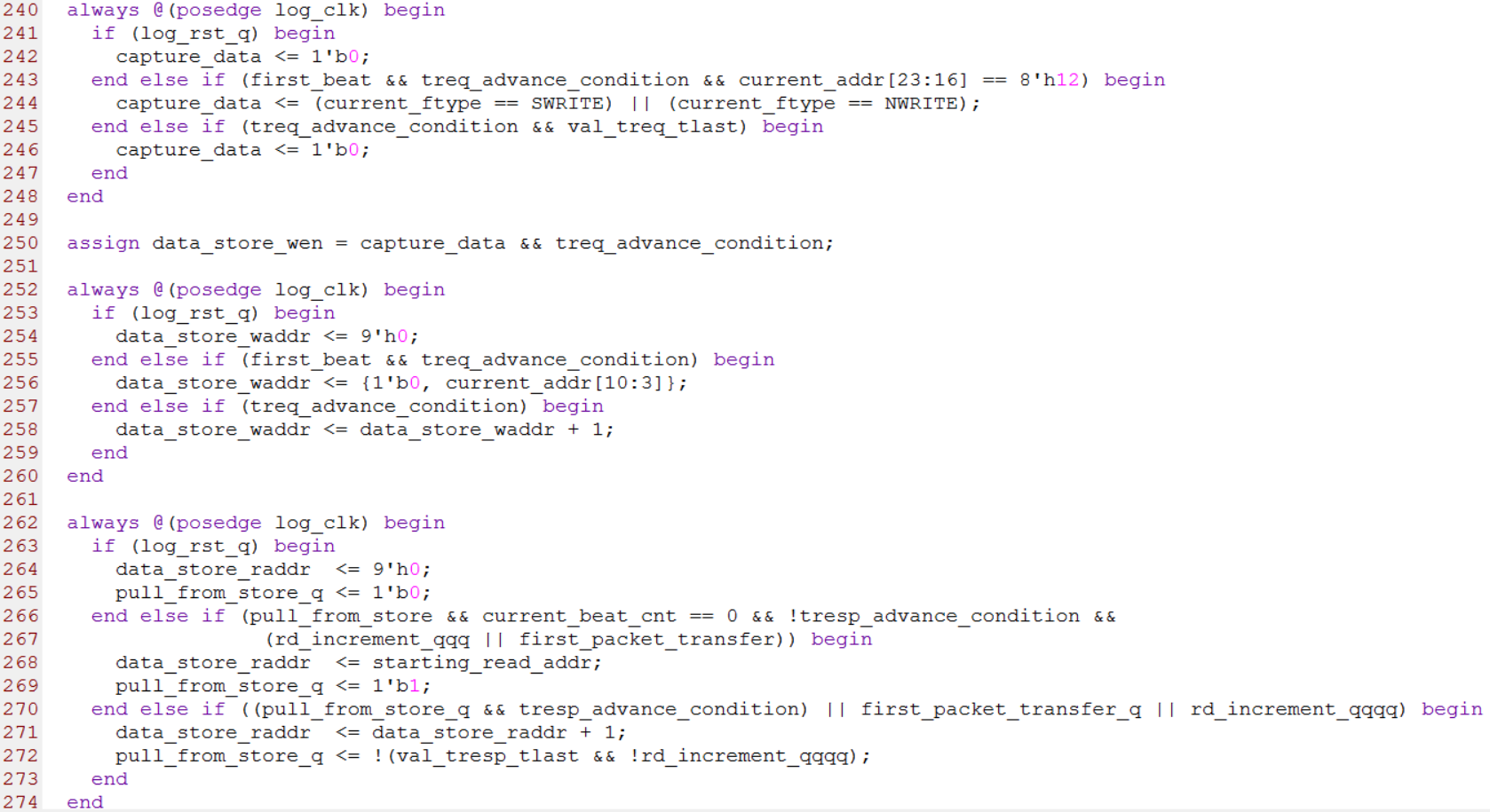 第240行到274行与本地数据的存储有关。其中第240行到250行的逻辑用来产生数据存取使能位data_store_wen,本文第3.3节提到过,只有地址字段的第23位到第16位为8’h12时,写事务的数据才能被存放到本地存储器,原因就是第243行的判断语句加上了这个判断。第252行到260行的逻辑用来产生数据存储的写地址信号data_store_waddr。第262行到274行的逻辑用来产生数据存储的读地址信号data_store_raddr。源代码如下图所示